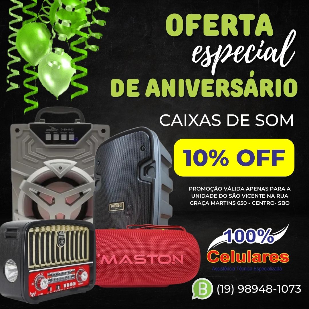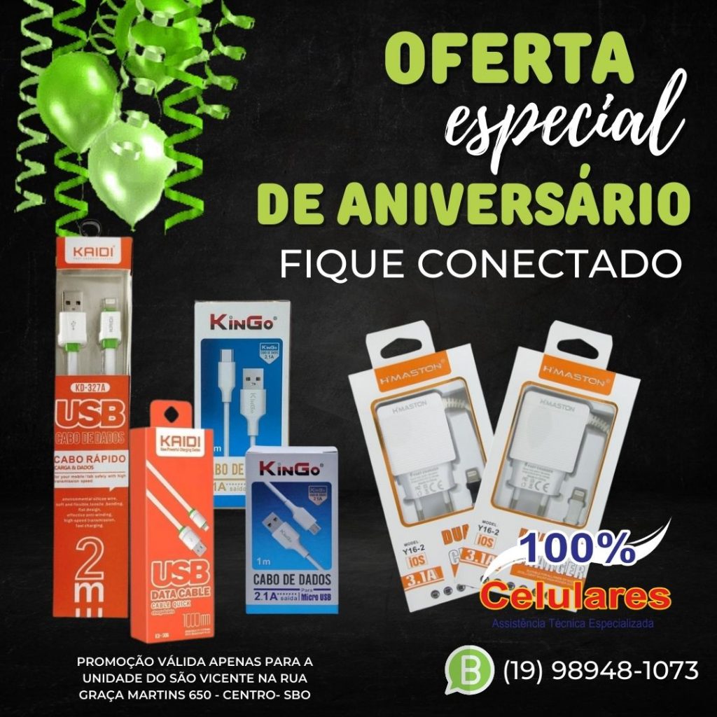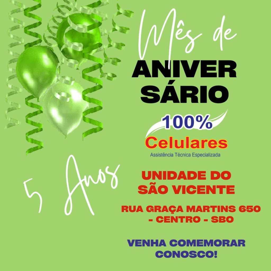 Com layout moderno e conceito inovador, a loja 100% Celulares localizada dentro do Supermercado São Vicente, está comemorando neste mês de março 5 anos de vida. A loja acompanha a excelência no atendimento da marca 100% Celulares e oferece uma experiência única quando o assunto é assistência técnica como troca de frontal, reparo em placa, desbloqueio, troca de componentes e acessórios em geral.