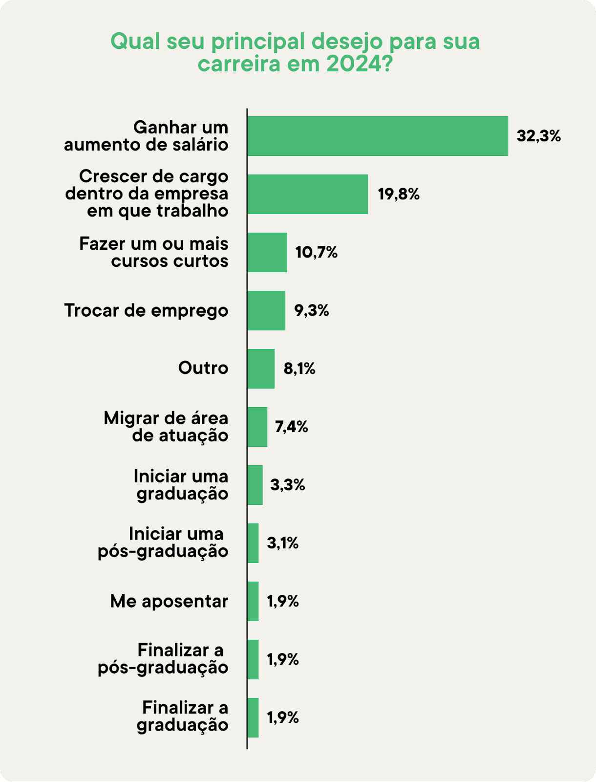 Em relação aos objetivos profissionais, a Onlinecurriculo, plataforma de currículos online, realizou uma pesquisa que revelou que o maior desejo do brasileiro para 2024 é ganhar um aumento de salário, conforme indicado por 32% dos entrevistados do estudo. Entre as outras metas, 20% desejam crescer de cargo dentro da empresa onde trabalham; 11% querem fazer um ou mais cursos curtos; 9% almejam trocar de emprego, e 7% gostariam de mudar de área de atuação.