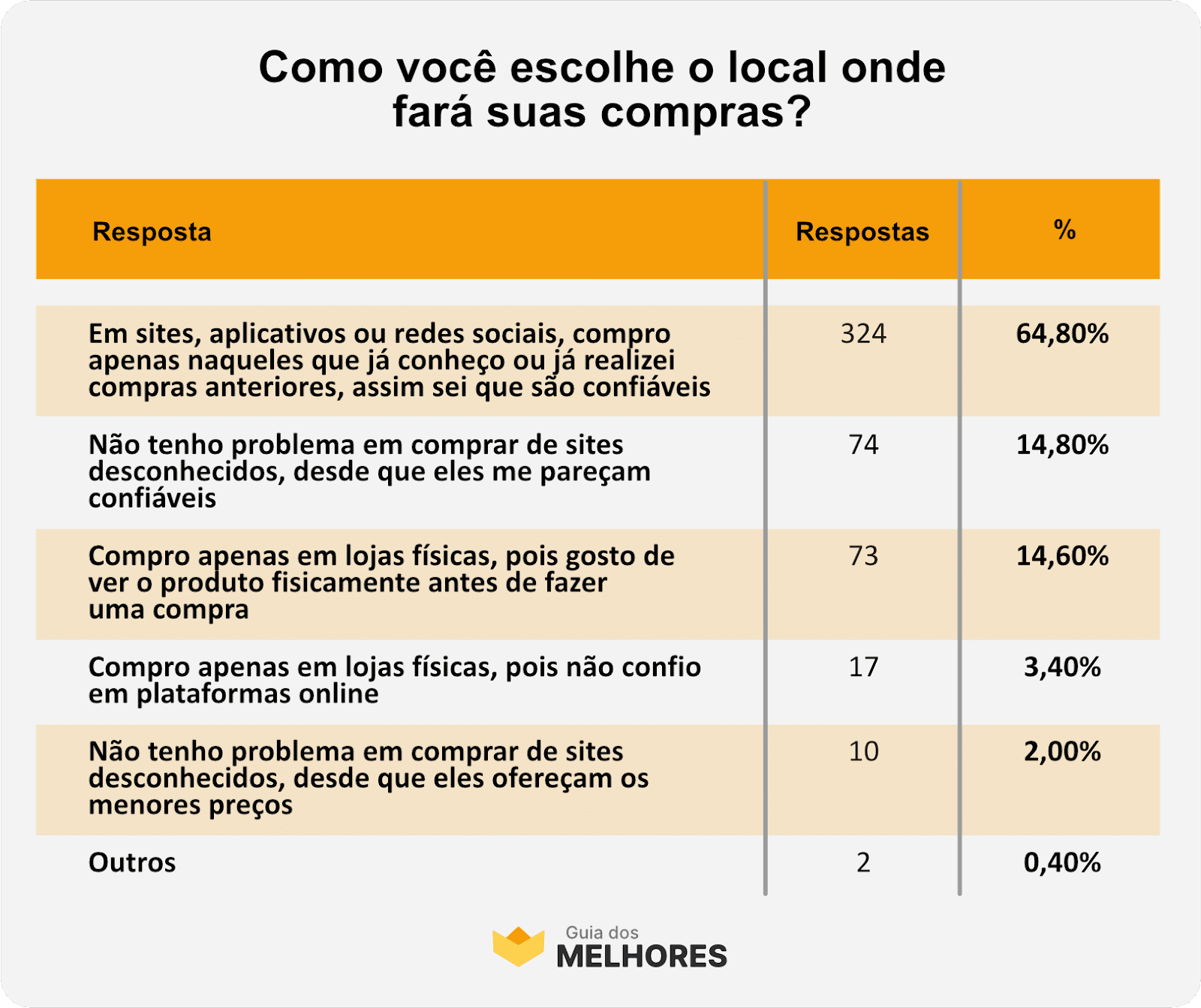 A grande maioria, que representa 65% dos respondentes, disse realizar suas compras apenas em sites, aplicativos ou redes sociais de lojas ou marcas que já conheça ou que já tenha realizado compras anteriormente; 15% dos perguntados optam por fazerem suas compras apenas em lojas físicas, pois gostam de ver os produtos fisicamente antes de adquiri-los e, com mesma porcentagem, 15% afirmam não terem problemas em comprar em sites desconhecidos, desde que esses pareçam confiáveis.