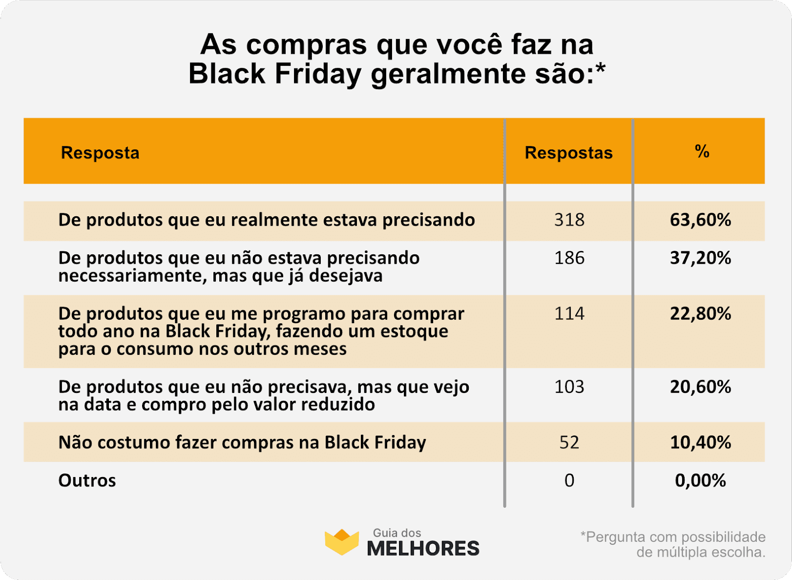 Em relação aos produtos que são adquiridos na Black Friday, 64% dos entrevistados indicaram que suas compras são principalmente de produtos dos quais eles realmente estavam precisando; 32% disseram que, muitas vezes, as compras na data são de produtos que não estavam precisando necessariamente, mas que já desejavam; 23% dos respondentes costuma aguardar para adquirir produtos para os quais se programa para comprar anualmente na data, fazendo um estoque dos itens para consumi-los ao longo dos outros meses, e, para 21%, as compras geralmente são de produtos que não precisavam, mas que acabam adquirindo pelo valor reduzido.