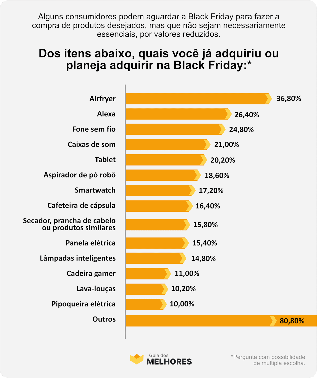 Quanto aos produtos, a Black Friday se mostra como uma boa oportunidade para aquisição de alguns itens que podem não ser essenciais, mas que são artigos de desejo de muitos por trazerem facilidades para o dia a dia. Dentre esses produtos, aqueles que mais possuem intenção de compra ou que mais foram adquiridos na data são a airfryer, que com 37% das respostas ainda se mostra como uma queridinha entre os consumidores; indicada por 26%, na segunda colocação, aparece a Alexa, assistente virtual da Amazon; os fones sem fio foram escolhidos por 25% dos entrevistados; caixas de som por 21%; tablet foi apontado por 20%; aspirador de pó robô foi escolhido por 19% dos respondentes; smartwatches por 17%, e as cafeteiras de cápsula indicadas por 16% dos entrevistados.