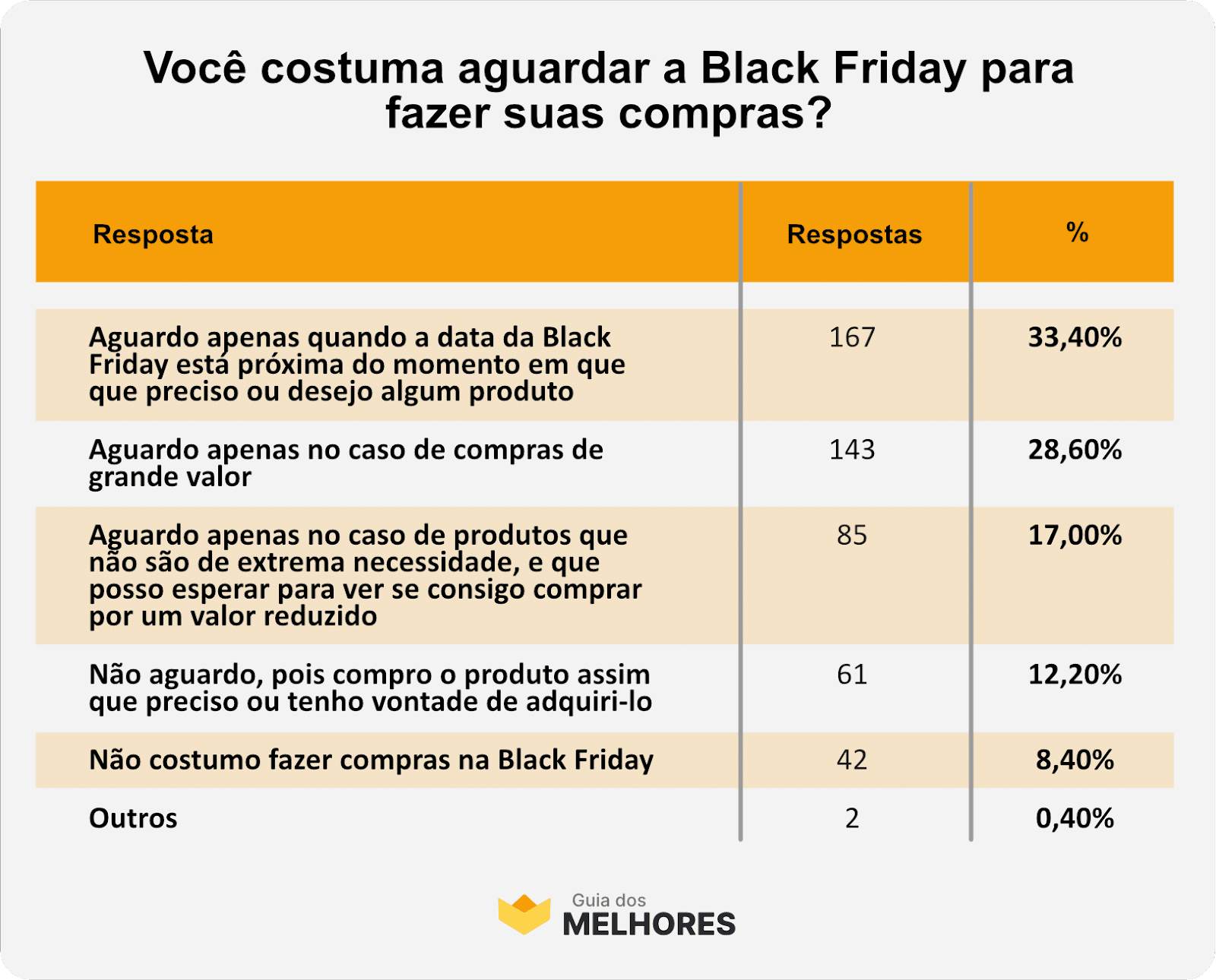 E os consumidores realmente esperam a Black Friday para fazerem suas compras? 33% dos entrevistados disseram que aguardam a Black Friday para fazerem compras apenas quando a data está próxima do momento em que precisa ou deseja um produto; 27% esperam apenas no caso de compras de grande valor; 17% aguardam no caso de produtos que não são de extrema necessidade, e que podem esperar para ver se conseguem comprar por um valor reduzido; 12% disseram não aguardar, pois compram o produto assim que precisam ou tem vontade de adquiri-lo, e apenas 8% dizem que não costumam fazer compras na Black Friday.