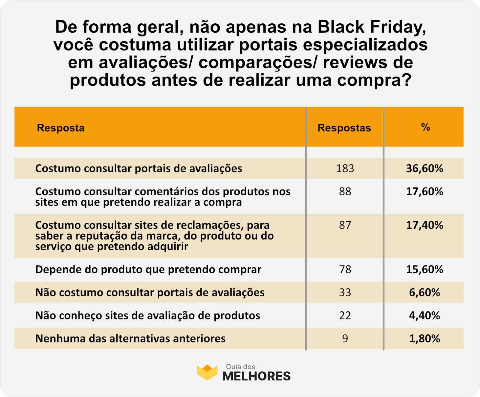 Quando perguntados sobre o costume de consultar portais que trazem avaliações de produtos, de forma geral, e não apenas na Black Friday, 37% dos entrevistados afirmaram consultar esses portais antes de realizarem suas compras. Os demais respondentes costumam consultar os comentários dos produtos nos próprios sites em que pretendem realizar as compras (18%) ou verificar sites de reclamações para saber a reputação da marca, do produto ou do serviço que pretendem adquirir (17%).