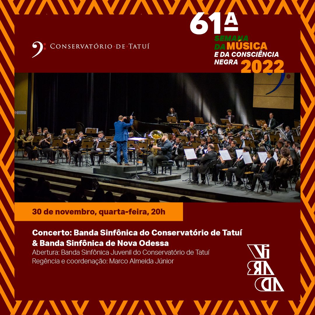 Nesta quarta-feira (30/11), às 20h, a Banda Sinfônica Municipal Professor Gunars Tiss, mantida pela Prefeitura de Nova Odessa e atualmente sob a regência do maestro Marco Almeida Jr, participa de um concerto especial na 61ª Semana da Música do Conservatório de Tatuí, uma das mais respeitadas escolas de música da América Latina.