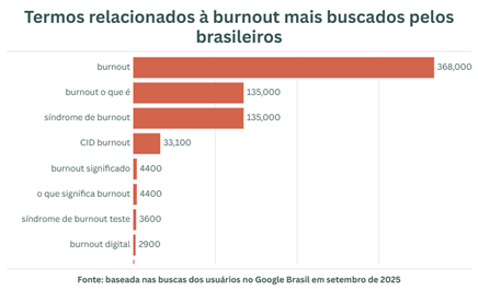 Em contraposição, as 33.100 pesquisas sobre o CID indicam conhecimento da mudança recente, registrada no início de 2025, que incluiu a síndrome de burnout na Classificação Internacional de Doenças no Brasil com o CID-11. Essa atualização representa um avanço importante para a crise de saúde pública causada pelos sintomas desse transtorno.