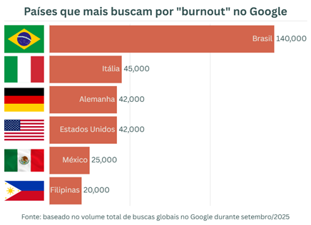 O objetivo do levantamento realizado pela Psitto, plataforma de psicologia online, mapeia as métricas do Google Brasil durante o mês de setembro deste ano, o interesse dos brasileiros por termos relacionados ao burnout. Os resultados mostraram que o Brasil tem índices de busca superiores aos de outros países, conforme evidencia o ranking abaixo.