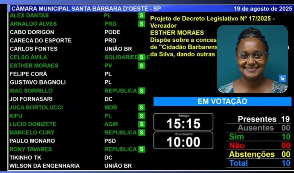 Sem discussões registradas em plenário, apenas 10 votos foram computados, número suficiente para aprovar o título honorífico — já que o Legislativo conta com 19 parlamentares.