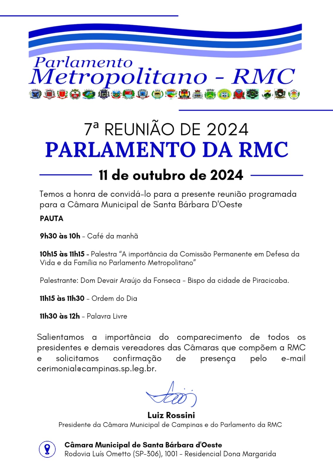 A Câmara Municipal de Santa Bárbara d’Oeste sedia a 7ª reunião do Parlamento da Região Metropolitana de Campinas (RMC) na próxima sexta-feira, dia 11 de outubro, a partir das 9h30. O Parlamento, composto por representantes do Poder Legislativo das 20 cidades da região, se reúne mensalmente para debater questões de interesse comum e apresentar suas demandas ao governo estadual.