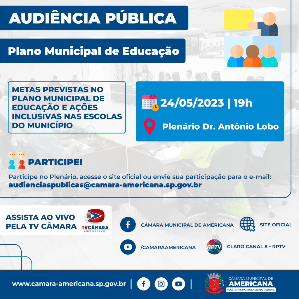 A Câmara Municipal de Americana irá realizar no dia 24 de maio, a partir das 19h, uma audiência pública para debater as metas previstas no Plano Municipal de Educação e ações inclusivas nas escolas do município, em atendimento a um requerimento de autoria da vereadora Professora Juliana (PT).