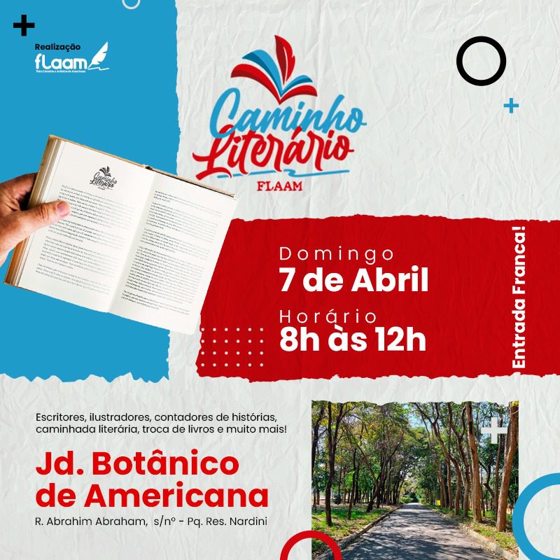 Imagine um domingo diferente: caminhar entre a sombra das árvores e percorrer um caminho repleto de escritores, ilustradores, livros e muita cultura. Com essa proposta, acontece no dia 7 de abril, das 8 às 12h, o Caminho Literário da FLAAM (Feira Literária e Artística de Americana) no Jardim Botânico Americana. Esse evento, com entrada franca, reúne escritores e ilustradores, oficinas gratuitas, distribuição e troca de livros, apresentações artísticas e muito mais.