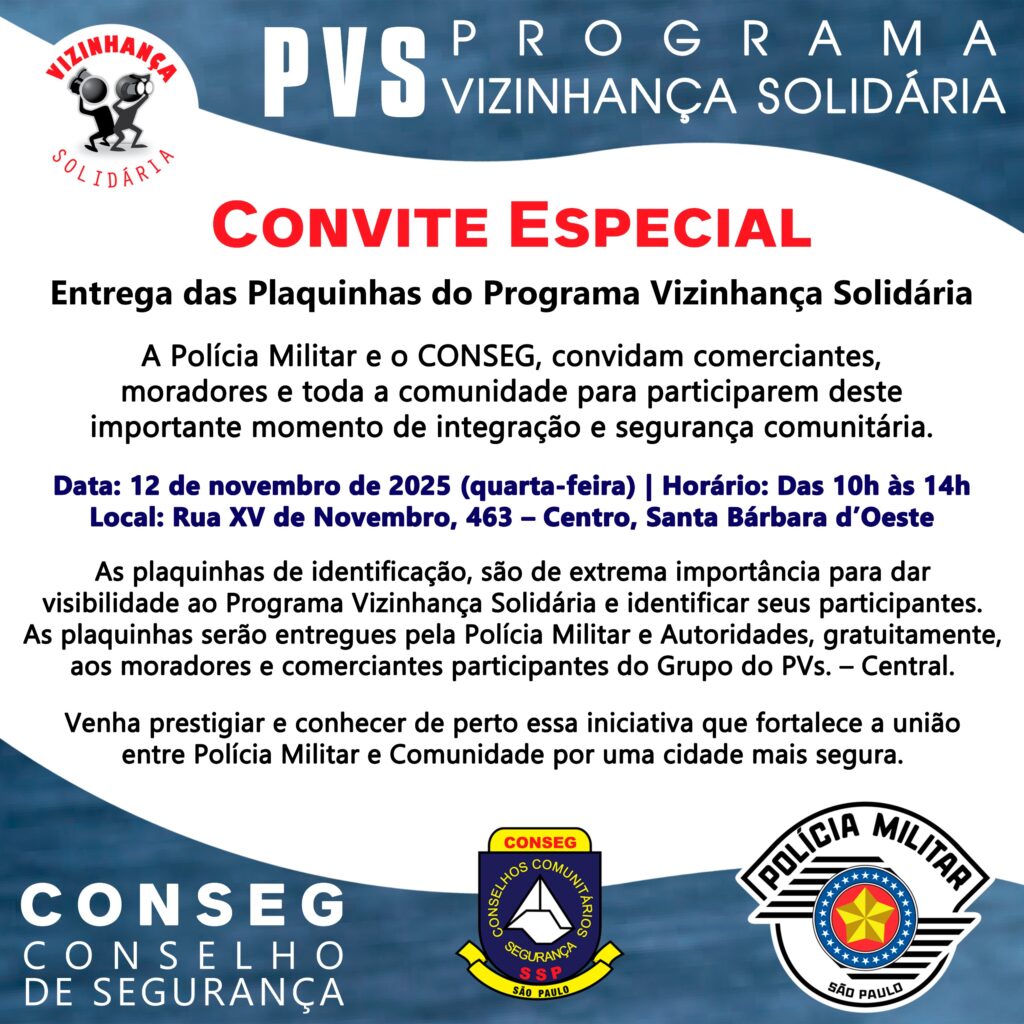 Santa Bárbara d’Oeste sediará na próxima quarta-feira (12) uma ação importante para o fortalecimento da segurança comunitária no município. O CONSEG (Conselho Comunitário de Segurança) promoverá a entrega oficial das placas do programa Vizinhança Solidária aos comerciantes do Centro, reforçando o compromisso conjunto entre população, comércio local e forças de segurança.