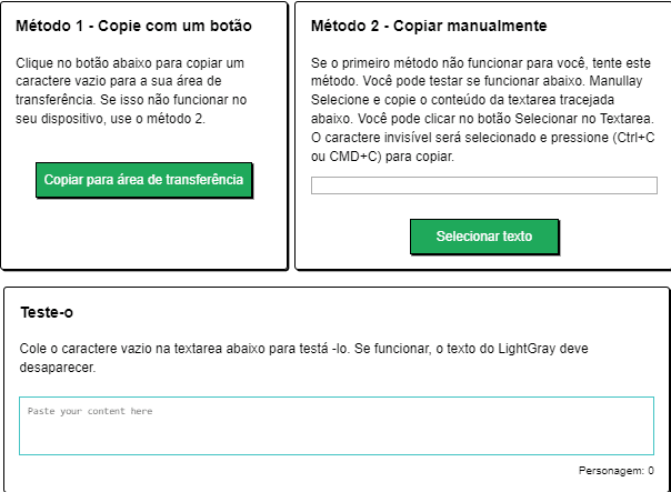 Outros métodos de envio de textos em branco como “Entidades HTML” não serão úteis neste contexto e por isso foram ignorados. Seu comportamento em aplicativos sociais/de mensagens de texto é muito errático para ser previsto. Variedade é o tempero da vida.