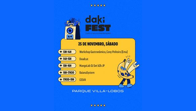 Está acontecendo em São Paulo, no Parque Villa-Lobos, o Daki Fest, festival que recebeu desde o dia 11 nomes como Seu Jorge, Liniker, MU540 e muito mais. O evento, realizado pela Mangolab, laboratório cultural que conecta público, marcas e música, fecha esse fim de semana, dias 25 e 26 de novembro, com shows de Marcelo D2, Duda Beat, BaianaSystem, vários DJ’s, workshops gastronômicos com chefs renomados, além de diversas outras atrações. Os ingressos custam a partir de R$90, no link.