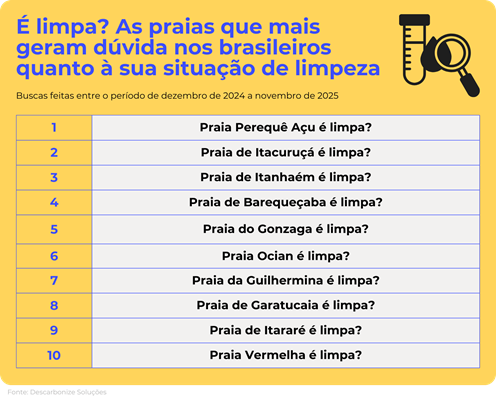 E essa preocupação já se reflete no comportamento digital:no último ano, a dúvida por “quais praias estão impróprias para banho?” tiveram um crescimento de 243%. O levantamento foi realizado pela Descarbonize Soluções, empresa especializada em energia solar e sustentabilidade, que analisou as buscas online pelo tema e revelou quais praias mais geram dúvidas nos brasileiros quando o assunto é a qualidade da água do mar.