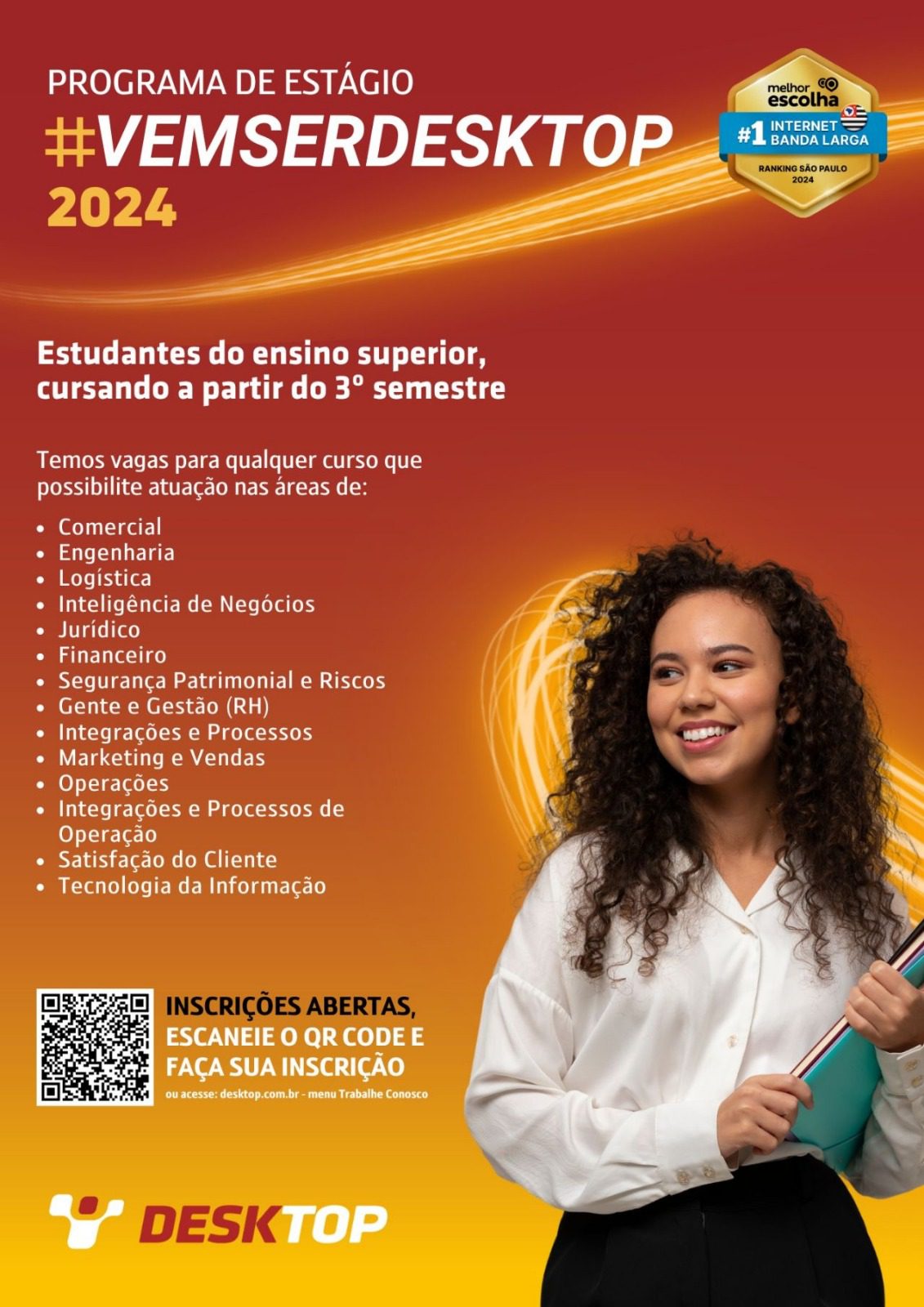 A Desktop, empresa de tecnologia e uma das principais provedoras de internet do Estado de São Paulo, está com inscrições abertas para a nova edição de seu Programa de Estágio. Os interessados devem estar cursando a partir do 3º semestre do ensino superior e possuir disponibilidade para atuar na cidade de Sumaré/SP em modelo híbrido de trabalho.