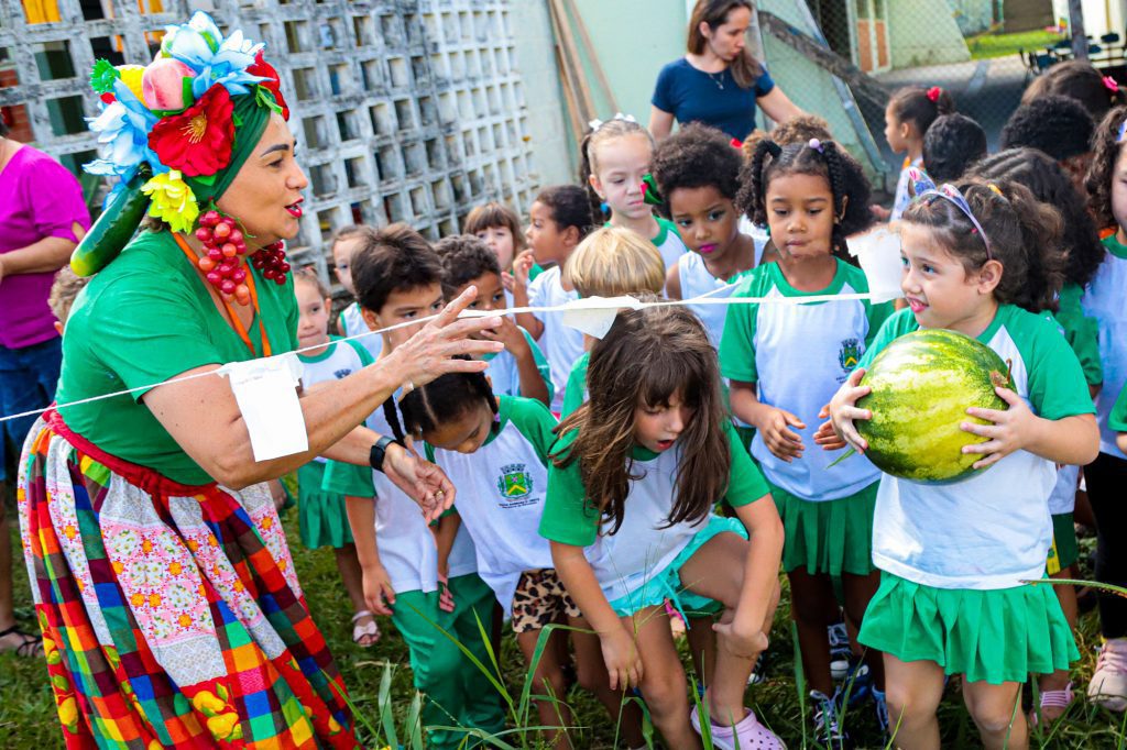 As crianças do Emei “Padre Mário Dantas de Menezes” receberam a visita da “Dona Frutela” na quarta-feira (12) para colher a fruta mais esperada dos últimos meses: a melancia. Parece história de criança e a ideia é exatamente essa. De maneira lúdica e divertida, a nutricionista Luciana Malta, do Setor de Alimentação Escolar da Secretaria de Educação, promove educação nutricional com o objetivo de incentivar e valorizar o consumo de alimentos saudáveis.
