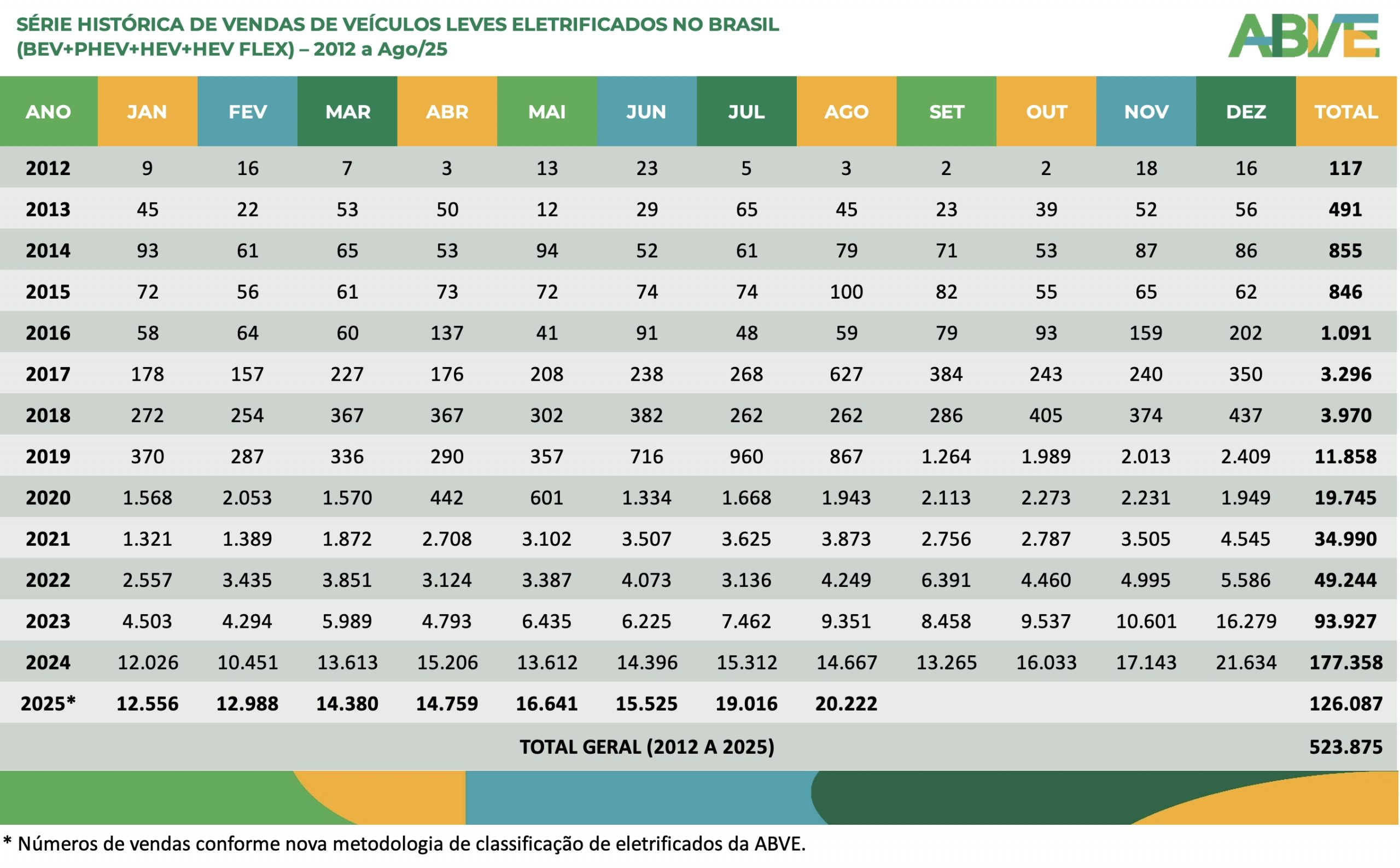 Na classificação da ABVE Data, os eletrificados incluem os BEV 100% elétricos, os PHEV (híbridos elétricos plug-in), HEV (híbrido sem recarga externa) e HEV Flex (híbridos a etanol). Não incluem os MHEV de 12v ou 48v (micro-híbridos).