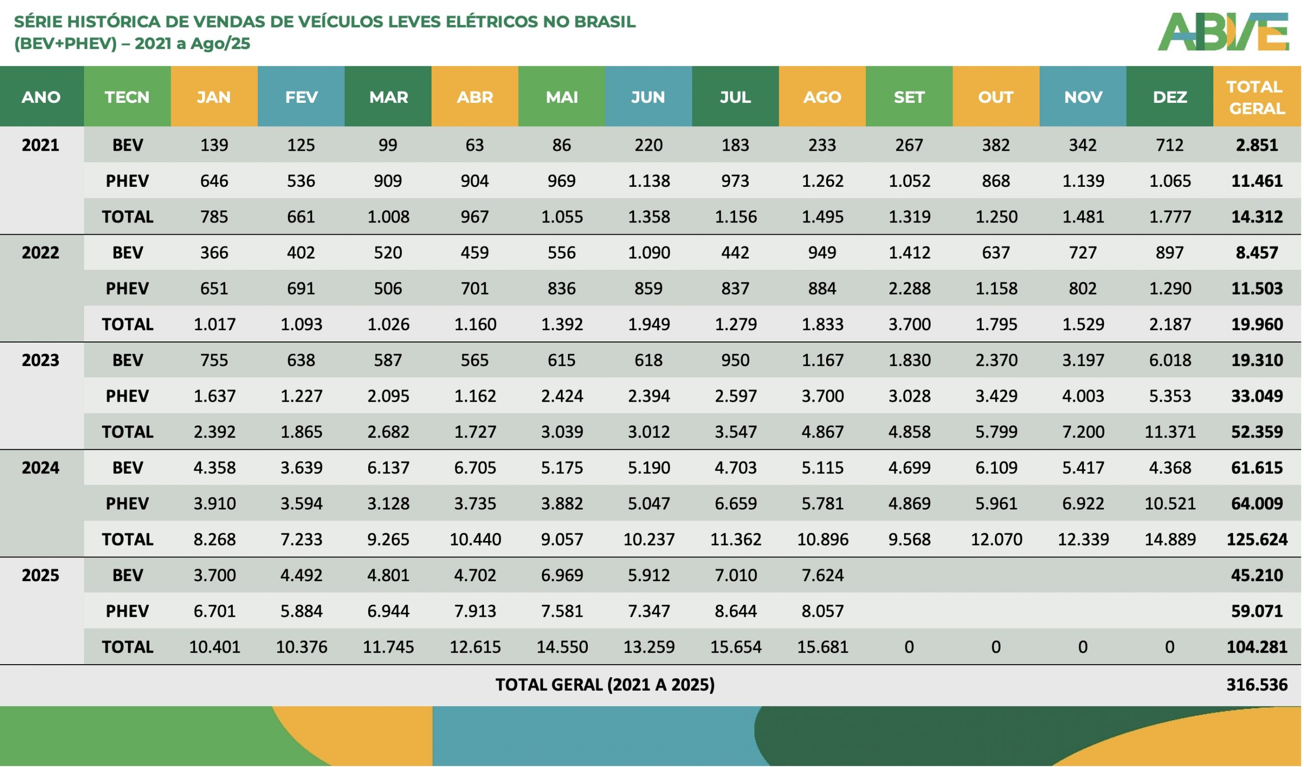 Série histórica de vendas de veículos leves elétricos no Brasil (BEV+PHEV) – 2021 a ago25