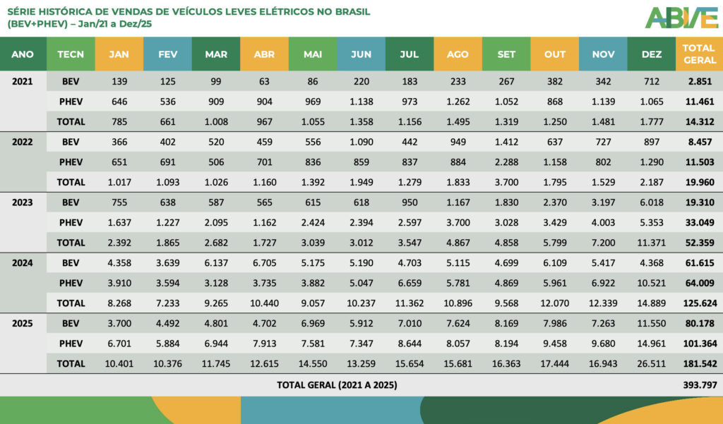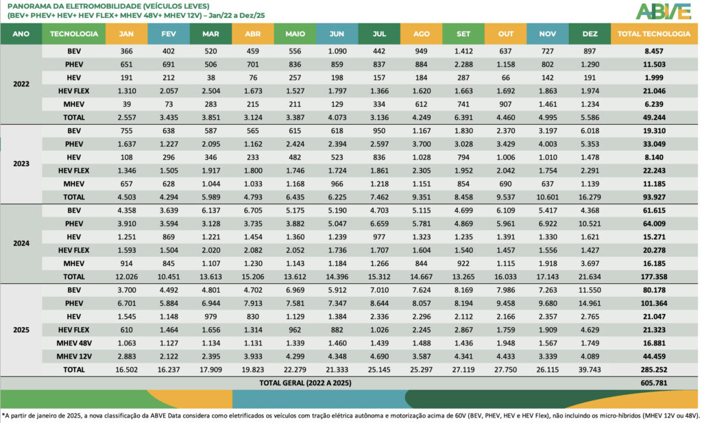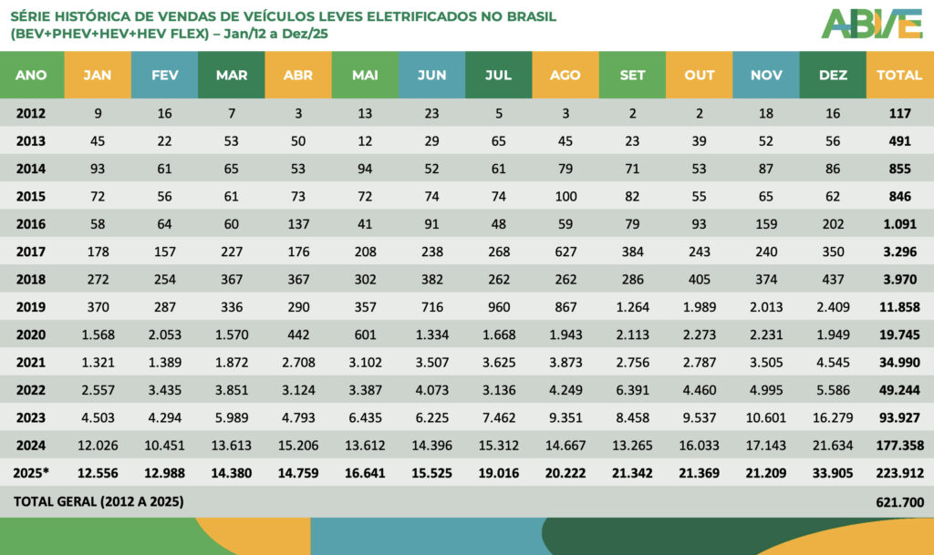 Depois de um mês de dezembro espetacular, o mercado de veículos eletrificados leves no Brasil fechou 2025 com 223.912 unidades vendidas, registrando um novo recorde anual da série histórica da ABVE e um crescimento de 26% sobre os números de 2024 (177.358). Só em dezembro foram 33.905 emplacamentos, 60% a mais do que em novembro (21.209) e 57% acima de dezembro de 2024 (21.634). Foi, por larga margem, o melhor mês da história da eletromobilidade no país, com participação de 13% sobre as vendas totais de veículos leves no mercado doméstico.