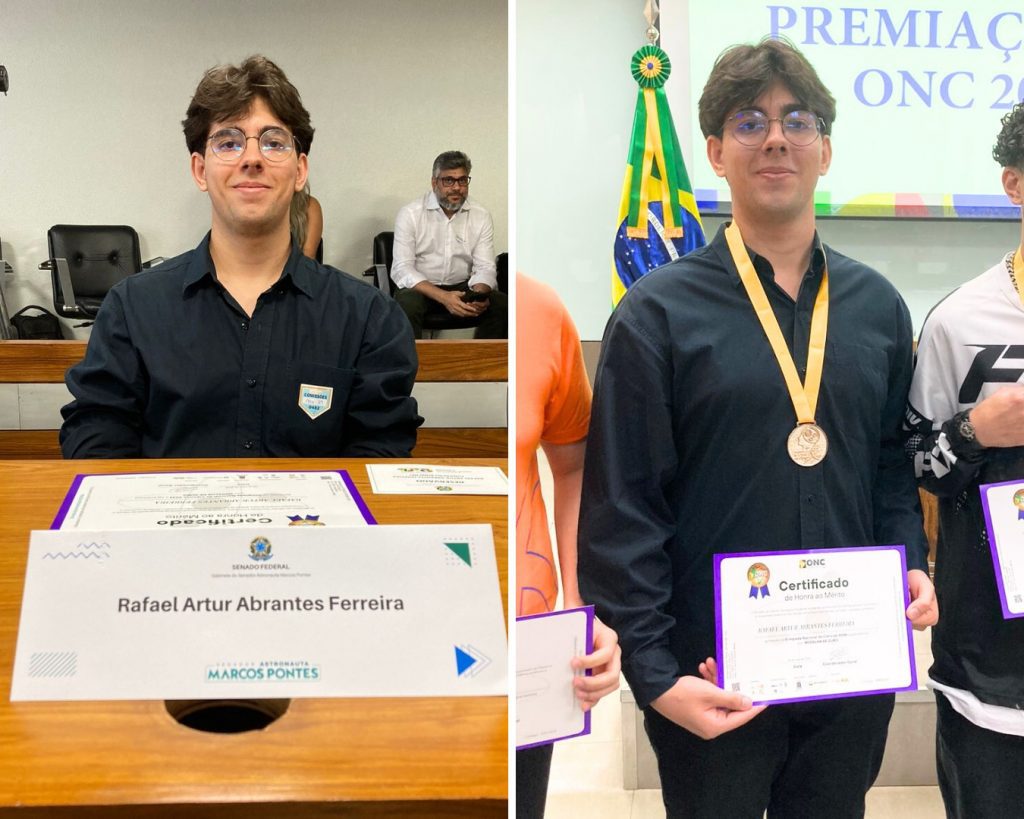 Rafael Artur Abrantes Ferreira, aluno do 3º ano do Ensino Médio do NEI – Núcleo de Educação Integrada da Fundação Romi, foi agraciado com a medalha de ouro, sendo um dos 10 melhores classificados nacionais em seu nível na Olimpíada Nacional de Ciências (ONC) 2024. A cerimônia de premiação ocorreu nesta quarta-feira (04), no Ministério da Ciência e Tecnologia (MCTI), em Brasília, e contou com a presença da ministra Luciana Santos, do secretário de Ciência e Tecnologia para o Desenvolvimento Social, Inácio Arruda, além de estudantes e professores de várias regiões do país.