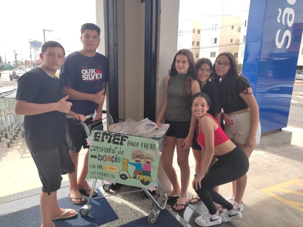 Alunos do 9º ano da Escola Municipal de Ensino Fundamental (EMEF) Paulo Freire, em Americana, entregam, nesta terça-feira (5), produtos de higiene pessoal e limpeza ao Lar dos Velhinhos São Vicente de Paulo, arrecadados durante o Trote Cultural e Solidário promovido na unidade. A iniciativa integra o projeto “Um ritual de passagem: a perspectiva do trote dos Formandos 2023 – O lúdico e o solidário no trote” desenvolvido pela equipe pedagógica da escola.