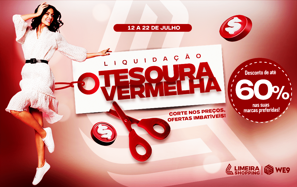 O Limeira Shopping oferece ao público uma oportunidade para compras com até 70% de desconto nas marcas preferidos do público. A partir desta sexta-feira, dia 12 de julho, começa a “Liquidação Tesoura Vermelha” com preços acessíveis aos consumidores.