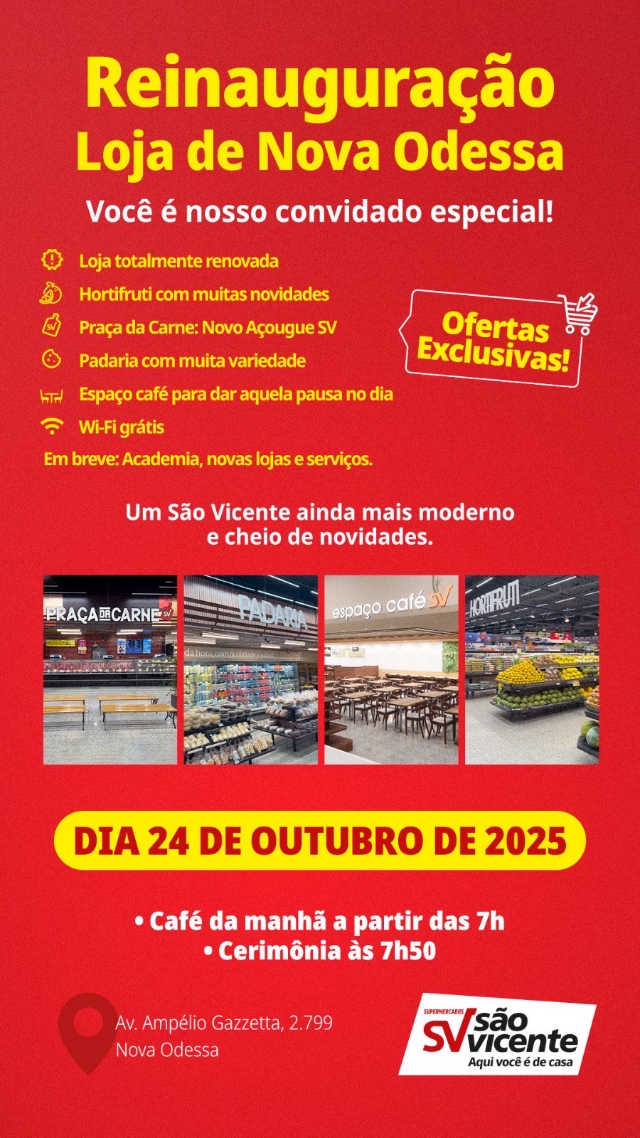 A unidade do Grupo São Vicente da cidade Nova Odessa está de cara nova. Com um investimento de R$10 milhões, a loja está mais moderna e será reinaugurada no próximo dia 24 de outubro com café da manhã a partir das 7h00 para clientes, autoridades, imprensa e convidados. A abertura oficial será às 8h00 com muitas ofertas especiais e exclusivas. Em dezembro, a loja completará 12 anos de história na cidade, no mesmo endereço, na Avenida Ampélio Gazzeta, atuando sempre com objetivo de oferecer qualidade, variedade e preços justos para os clientes.