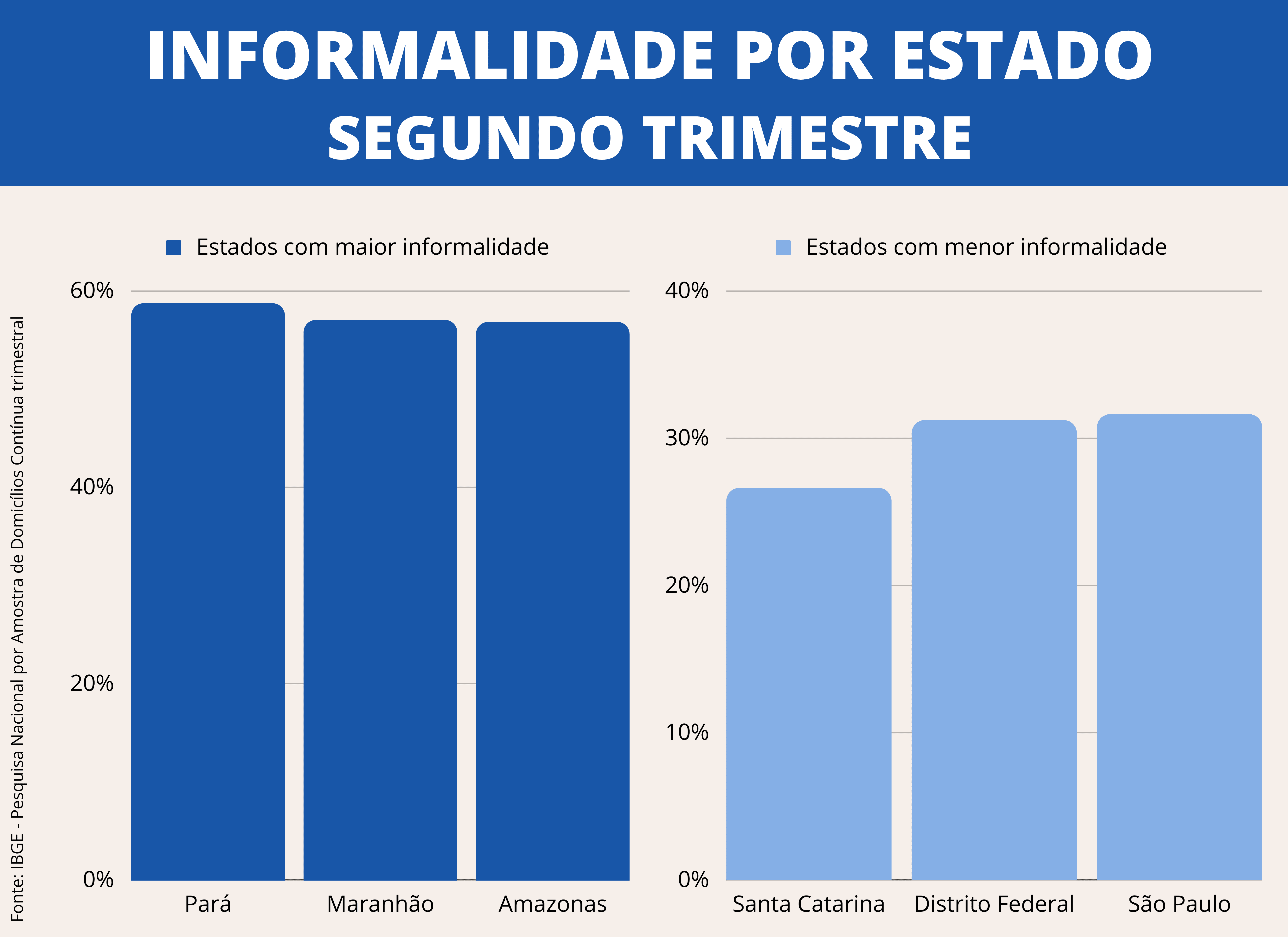 No relatório apresentado pelo órgão no segundo trimestre de 2023, o IBGE destacou os estados com as maiores taxas de informalidade no Brasil, sendo o Pará (58,7%) o primeiro, seguido pelo Maranhão (57,0%) e Amazonas (56,8%).