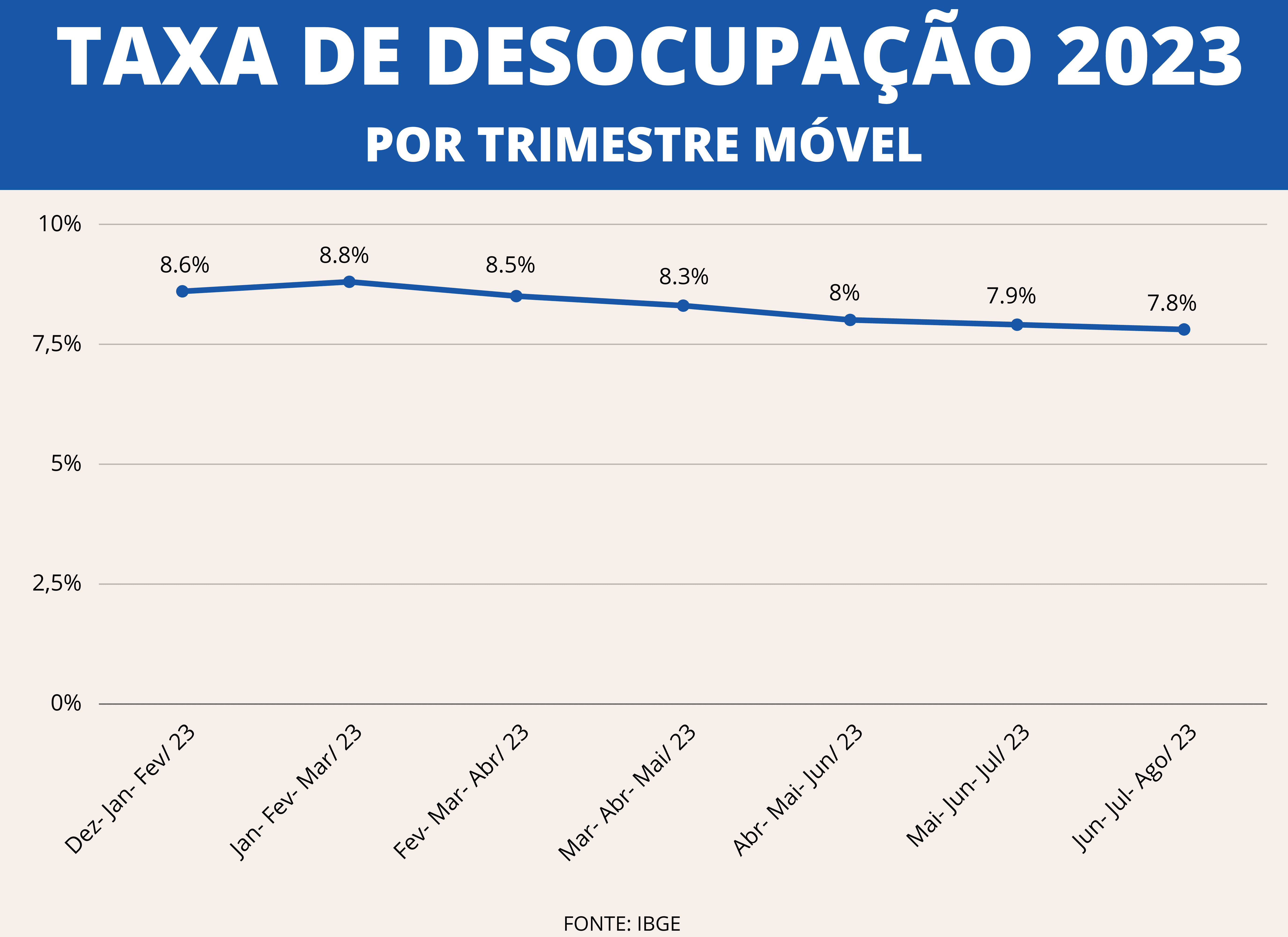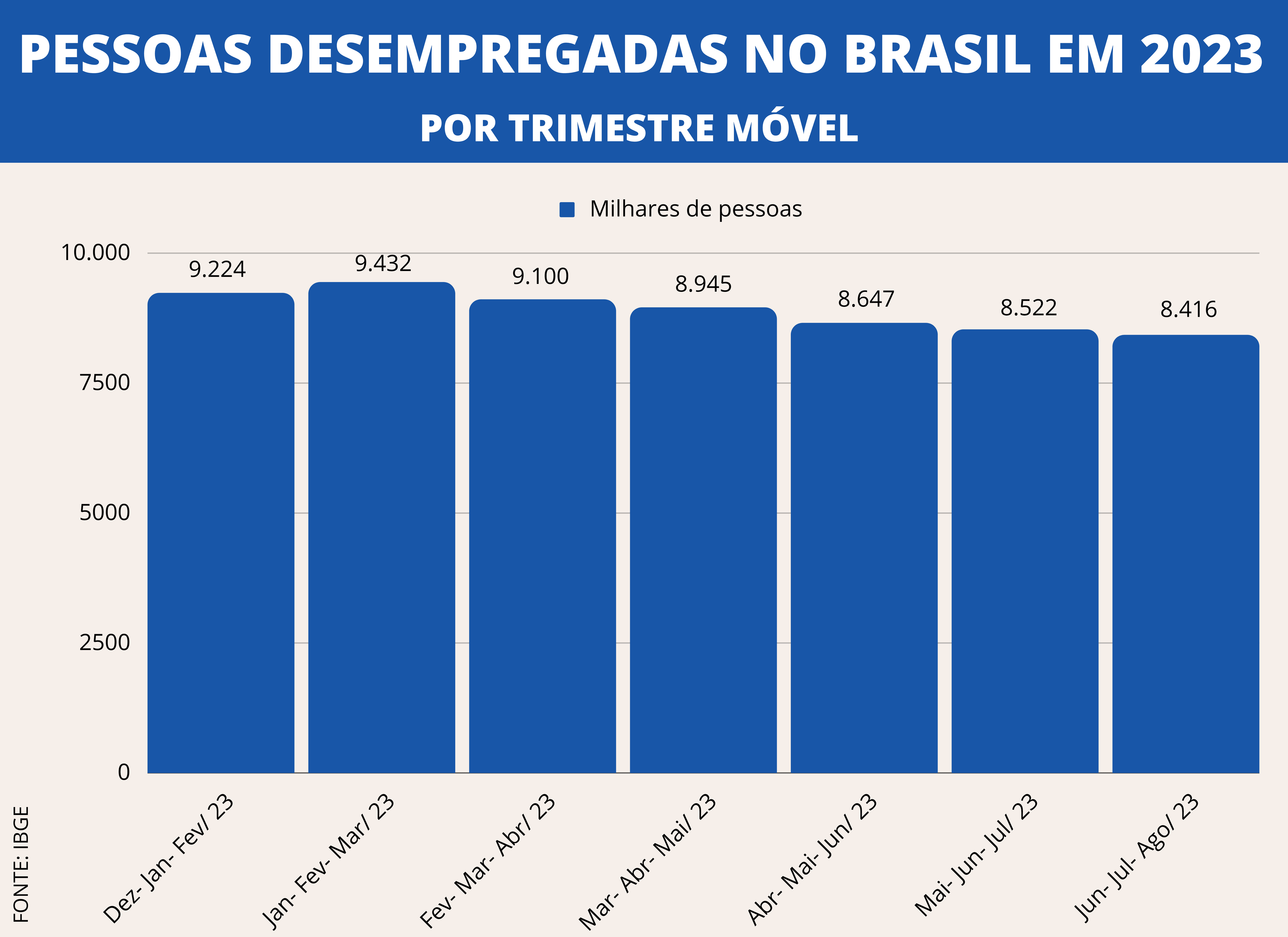 “O número de desempregados foi de 8,4 milhões no trimestre que terminou em agosto de 2023, o índice mais baixo desde o final do trimestre móvel em junho de 2015, quando foi de 8,5 milhões. Isso representa uma queda de 5,9% em relação ao trimestre encerrado em maio de 2023, o que significa que havia 528.000 desempregados a menos no país”, destaca o relatório.