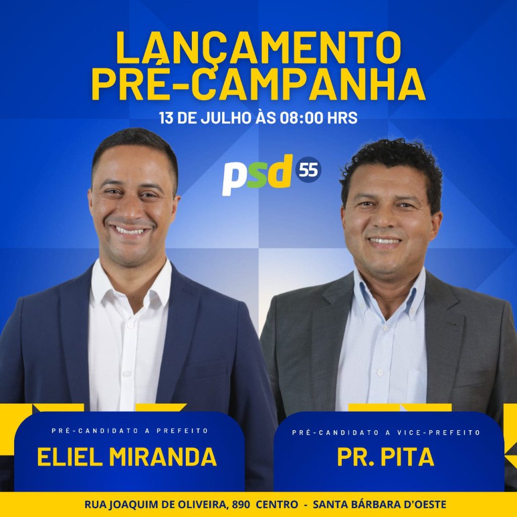 O PSD de Santa Bárbara anunciou oficialmente a pré-candidatura do vereador Eliel Miranda à prefeitura da cidade, com o lançamento marcado para o dia 13 de julho. Ao lado de Miranda, o pastor Edivaldo Pita, da Igreja Batista Memorial, foi confirmado como candidato a vice-prefeito.