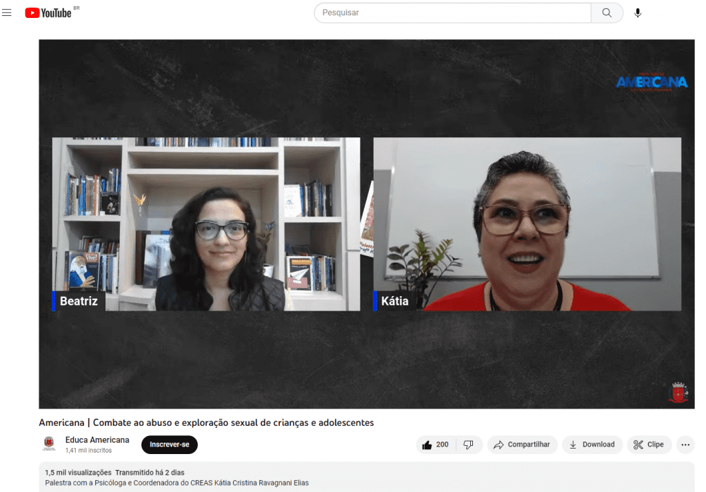 Em alusão à Campanha Faça Bonito – Proteja nossas Crianças e Adolescentes e ao 18 de maio, Dia Nacional de Combate ao Abuso e à Exploração Sexual contra Crianças e Adolescentes, foi publicada nesta quinta-feira (18) no canal da Secretaria de Educação, no YouTube, a palestra sobre o tema, apresentada pela psicóloga e coordenadora do Centro de Referência Especializado de Assistência Social (CREAS) de Americana, Katia Cristina Ravagnani Elias. A apresentação foi feita a educadores da rede municipal de Americana e está disponível a todos os interessados.