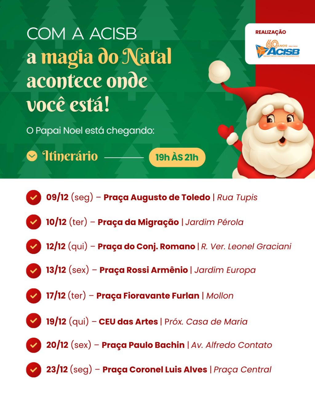 - 12/12 (quinta-feira) – Praça do Conj. Romano | Rua Ver. Leonel Graciani