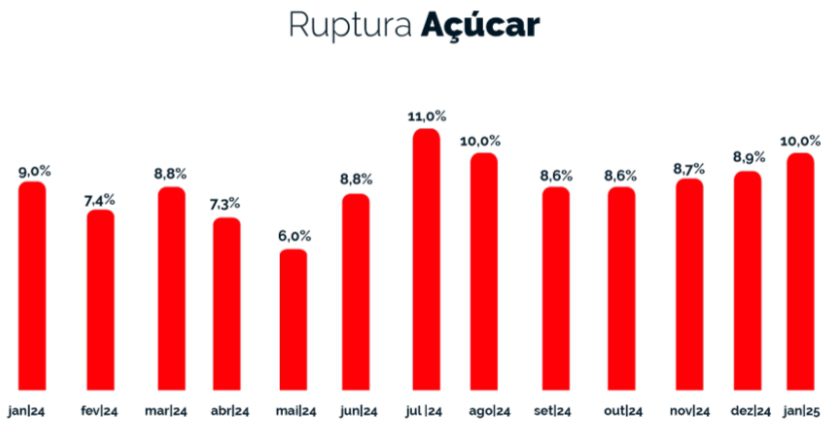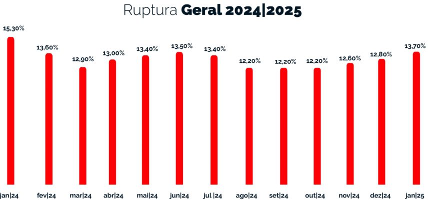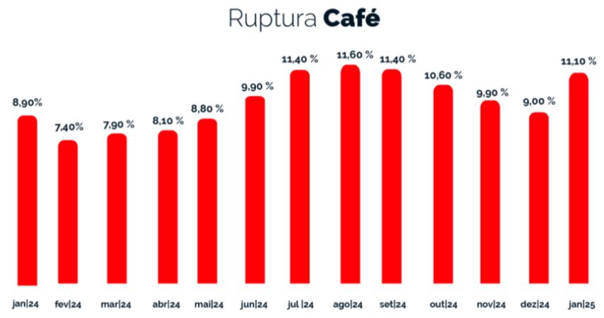 O Índice de Ruptura da Neogrid, indicador que mede a falta de produtos nas gôndolas dos supermercados brasileiros, registrou aumento em janeiro e a ruptura geral chegou a 13,7% – variação de 0,9 ponto percentual (p.p.) em relação a dezembro do ano passado. Este é o primeiro resultado superior a 13% desde agosto de 2024, após meses de estabilidade do índice na faixa dos 12% – nos últimos três meses, o indicador já vinha mostrando uma tendência de crescimento. Um dos destaques em aumento de ruptura é o café em janeiro, que subiu 2,1 p.p. ante o mês anterior, e que apresenta variação de preço de 66% em relação aos últimos 12 meses.
