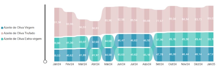 Após meses de equilíbrio e tendência de queda monitorada desde julho de 2024, o azeite voltou a subir neste mês, registrando alta de 1 p.p. e alcançando 7,6% de ruptura. Apesar do aumento, o cenário é mais favorável que o do início do ano passado, quando o índice do produto era de 17,5%. Nos preços, o azeite de oliva virgem teve uma leve redução, de R$ 48,14 para R$ 47,91, enquanto o extravirgem subiu de R$ 49,44 para R$ 50,18.