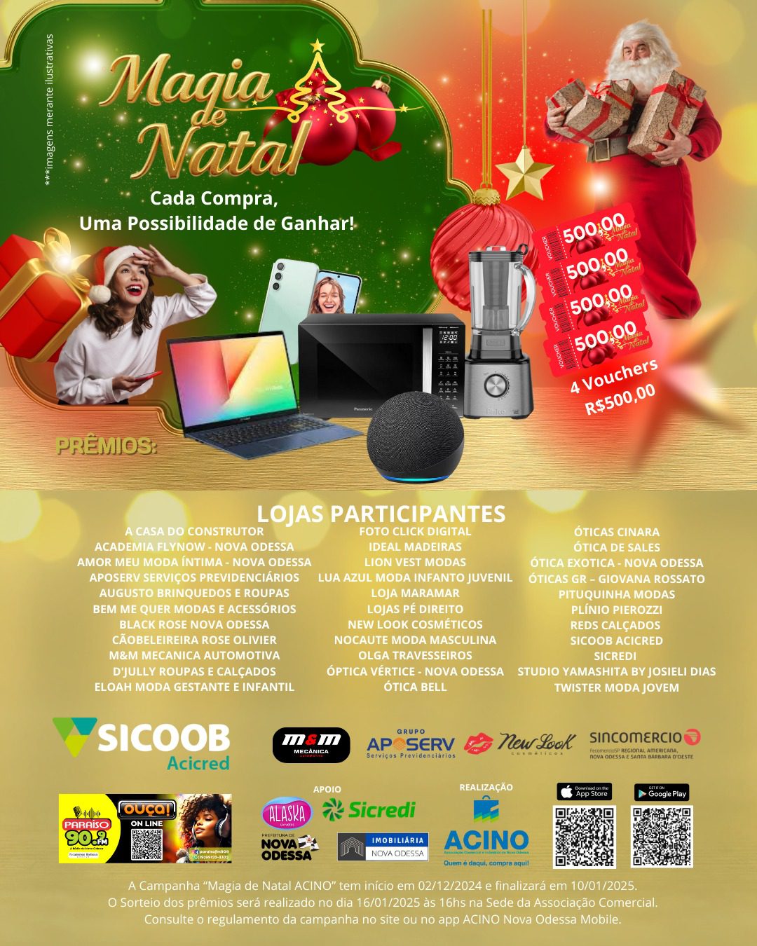#MagiadoNatalACINO #ACINONovaOdessa #CompreEGanhe #Natal2024 #ValeCompras #PrêmiosCampanhaNatal2024