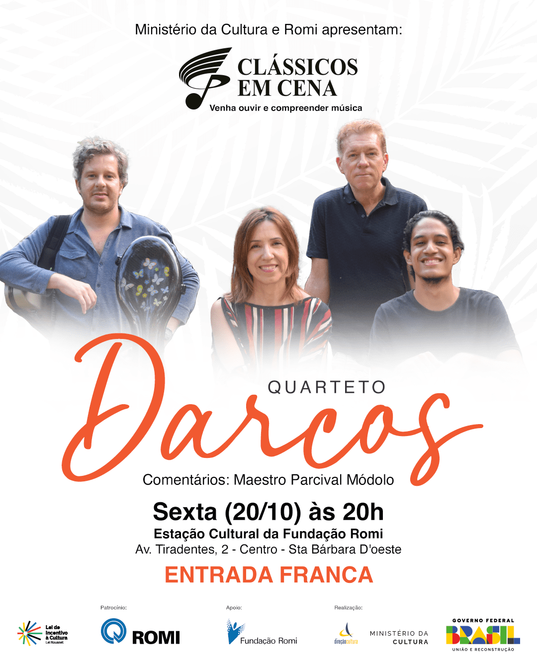 Em outubro, o projeto “Clássicos em Cena” em Santa Bárbara d’Oeste traz mais uma atração imperdível para os amantes da música: o Quarteto Darcos. Com o patrocínio da Romi S.A., por meio da Lei Federal de Incentivo à Cultura, o evento é gratuito e acontece no dia 20 de outubro (sexta-feira), às 20h, na Estação Cultural da Fundação Romi, no centro.