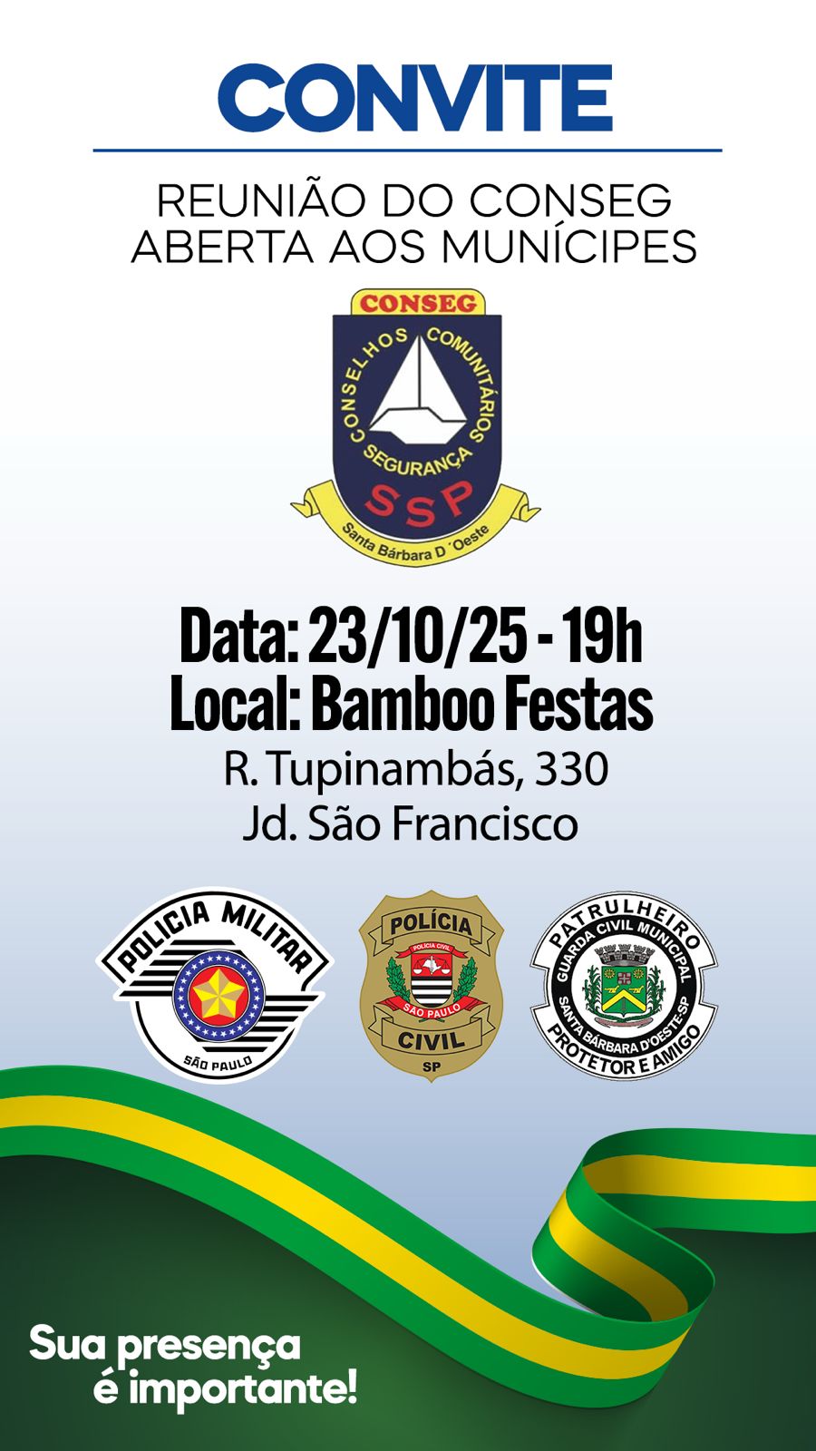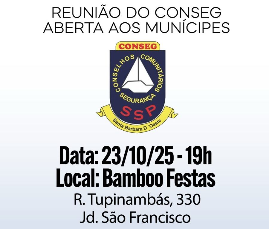 A próxima reunião do Conselho Comunitário de Segurança (CONSEG) de Santa Bárbara d’Oeste será realizada nesta quinta-feira (23), às 19h, no Bambu Festa, localizado no bairro São Francisco. O encontro é aberto ao público e tem como objetivo aproximar a comunidade das forças de segurança do município.