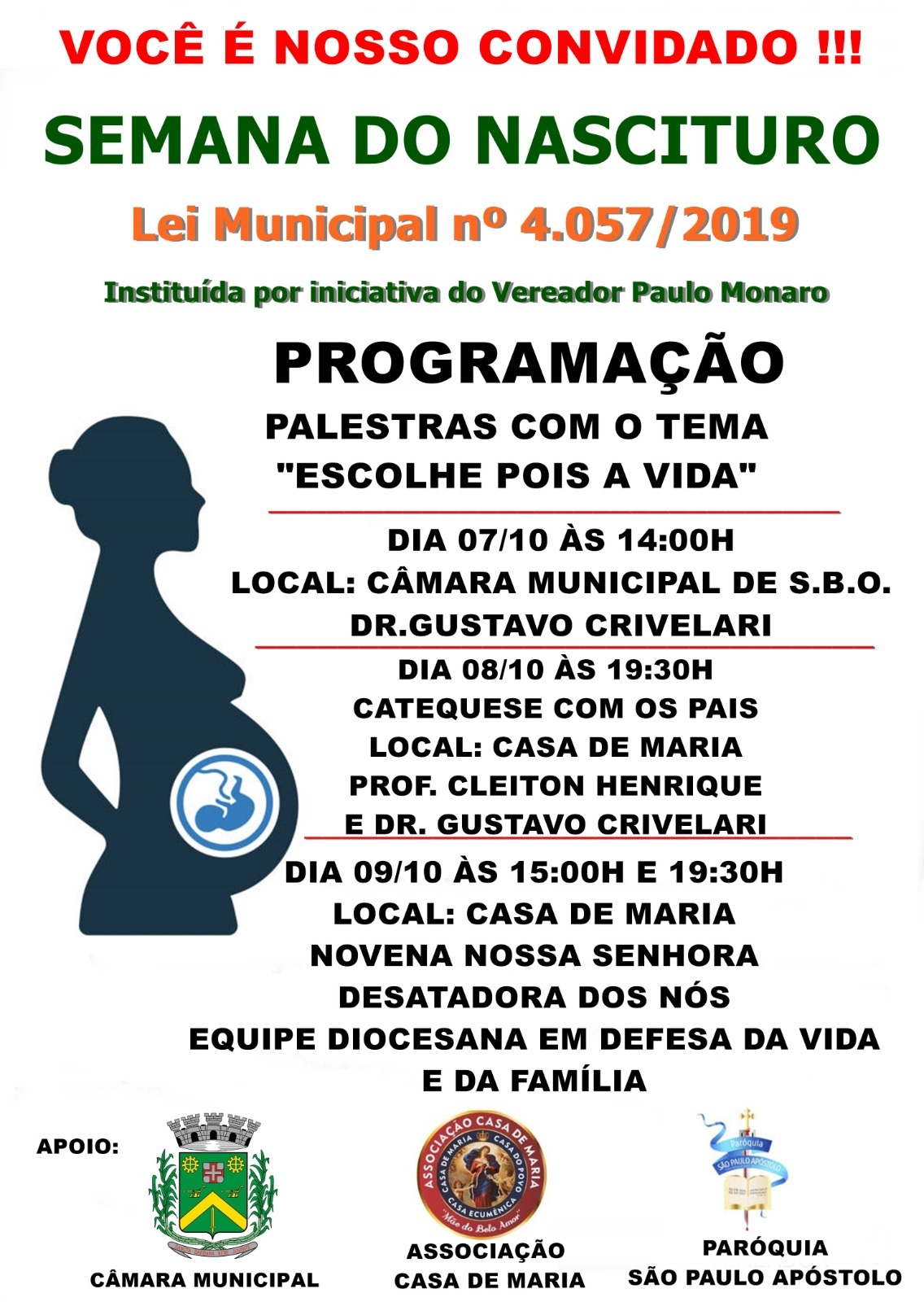A cidade Santa Bárbara d’Oeste promove, entre os dias 7 e 9 de outubro, a Semana do Nascituro, instituída pela Lei Municipal nº 4.057/2019, de autoria do vereador Paulo Monaro. O evento tem como objetivo valorizar a vida desde a concepção e promover reflexões sobre a importância da defesa da família e dos direitos fundamentais.