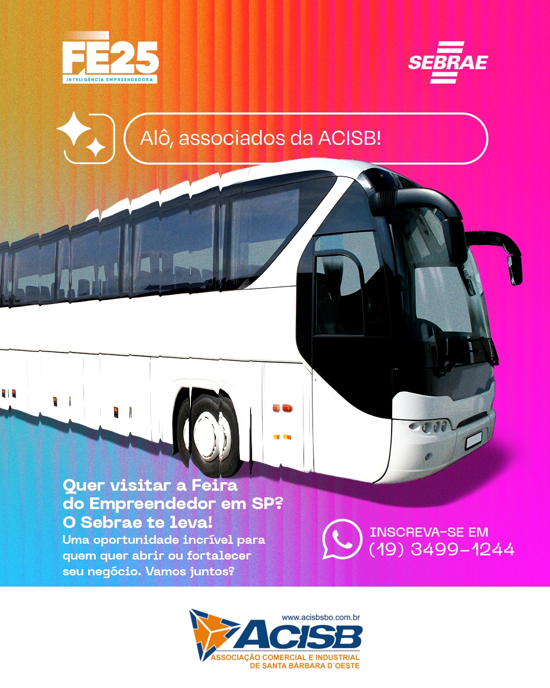O Sebrae Aqui Santa Bárbara d’Oeste, em parceria com a ACISB (Associação Comercial e Industrial de Santa Bárbara d’Oeste), disponibilizará transporte gratuito e acompanhamento durante o evento no dia 18 de outubro, sábado, com embarque em frente à sede da Associação.