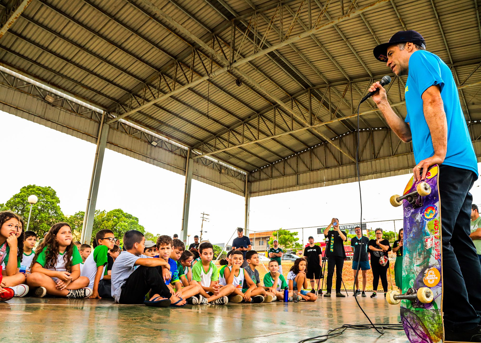 O atleta, hexacampeão mundial pela World Cup Skateboarding e medalha de ouro nos X Games, participou de uma atividade que reuniu 100 alunos do CIEP “Dom Eduardo Koaik”, com bate-papo e vivência prática na pista de skate do CEU das Artes.