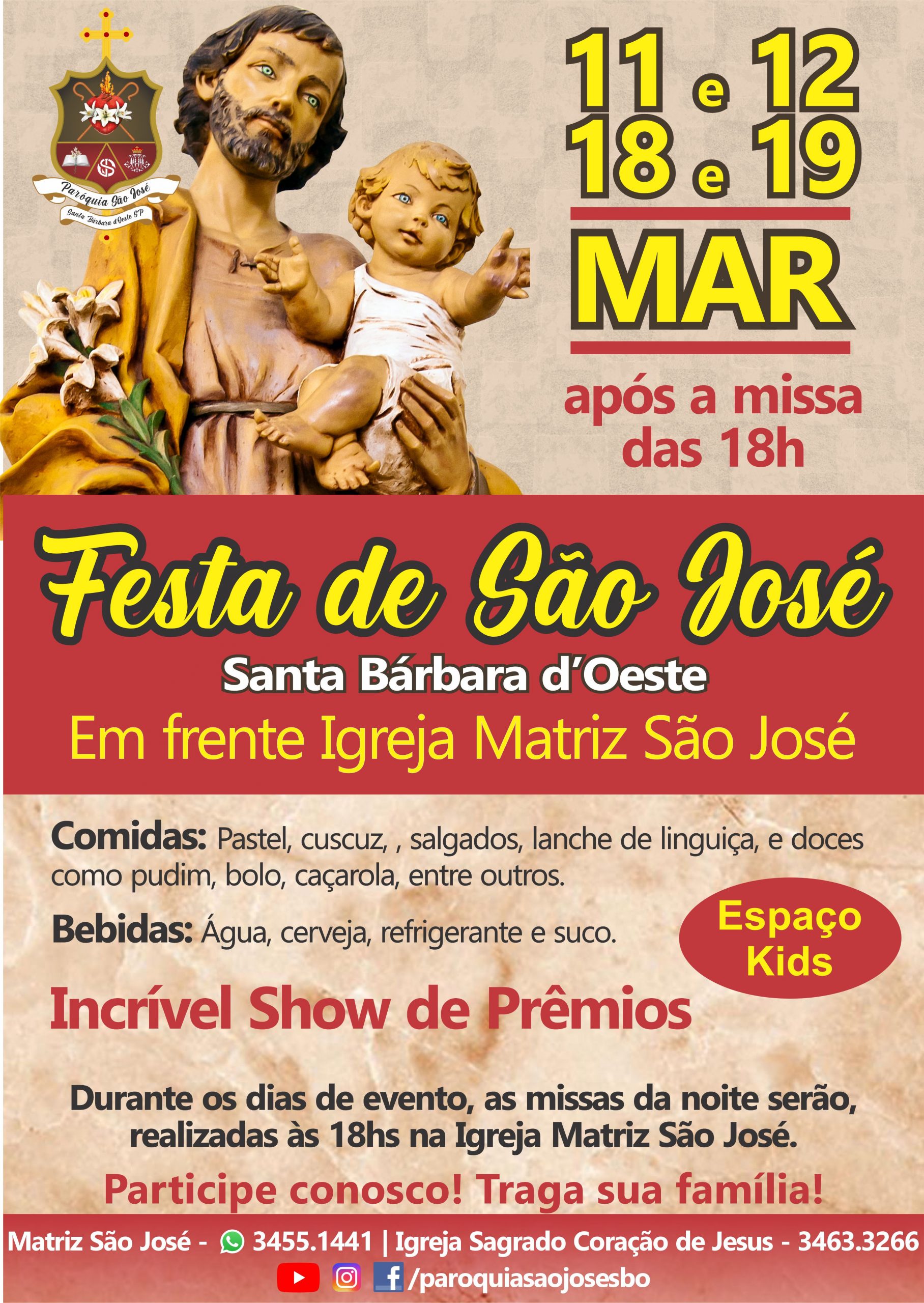 A tradicional festa de São José já tem data marcada! Serão dois finais de semana dedicados ao santo pai adotivo de Jesus e padroeiro da Paróquia São José, localizada no bairro Vila Grego. As comemorações estão marcadas para os dias 11 e 12, e 18 e 19 de março, após a santa missa realizada às 18h, na paróquia.