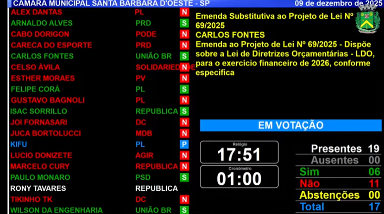 A sessão desta terça-feira (9) na Câmara Municipal de Santa Bárbara d’Oeste expôs, mais uma vez, a fratura política entre governo e oposição e levantou um debate urgente sobre o futuro da saúde pública da cidade. A análise da Lei de Diretrizes Orçamentárias (LDO) de 2026, contida no Projeto de Lei nº 69/2025, terminou com a rejeição da emenda substitutiva apresentada pelo vereador Carlos Fontes (União Brasil), que previa remanejamentos internos no orçamento para ações consideradas fundamentais por parte dos parlamentares: a compra de duas ambulâncias de UTI neonatal, a pavimentação de ruas no Jardim Adélia e no bairro Beira Rio e a construção de um ecoponto na Zona Sul.